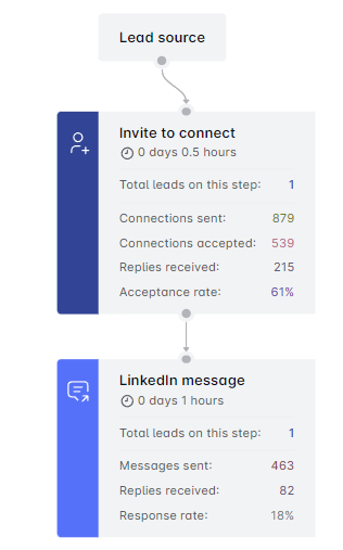 Scroll down for a detailed breakdown of each campaign step. See how many connections were sent, replies received, and emails/messages dispatched by MOO Marketing. It varies based on your campaign type and the steps included. Easily spot where your leads stand in the campaign.