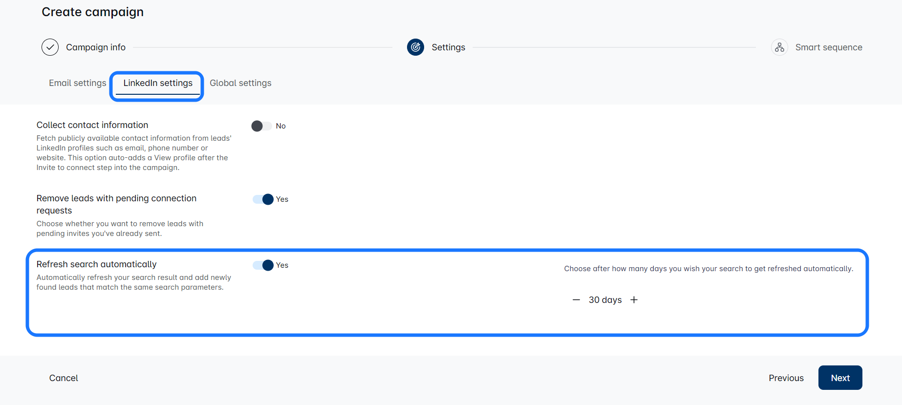 On the tab 'Campaign info', you will see the option to enable Refresh search here: