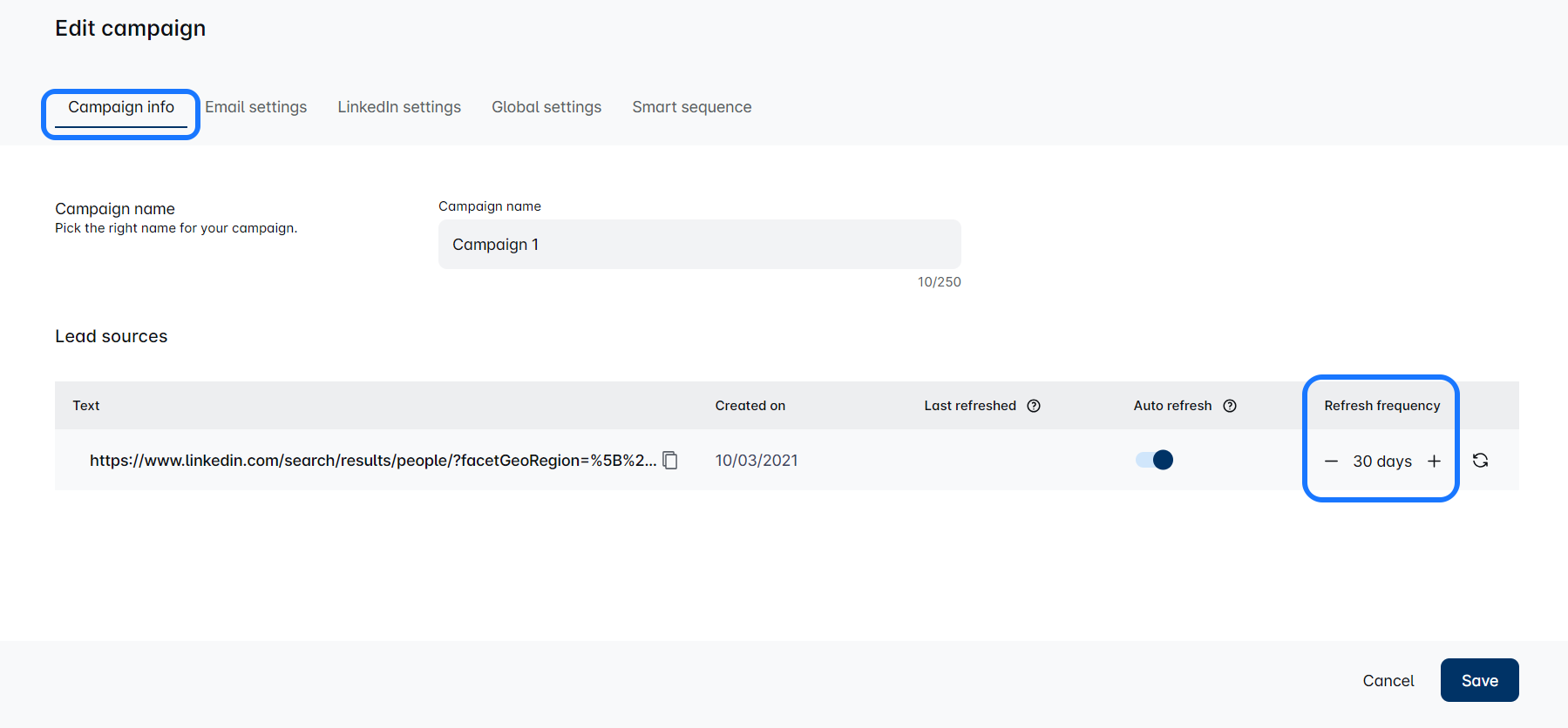 You can set up frequency for using this option by setting up days on how often should MOO Marketing refresh your search link.