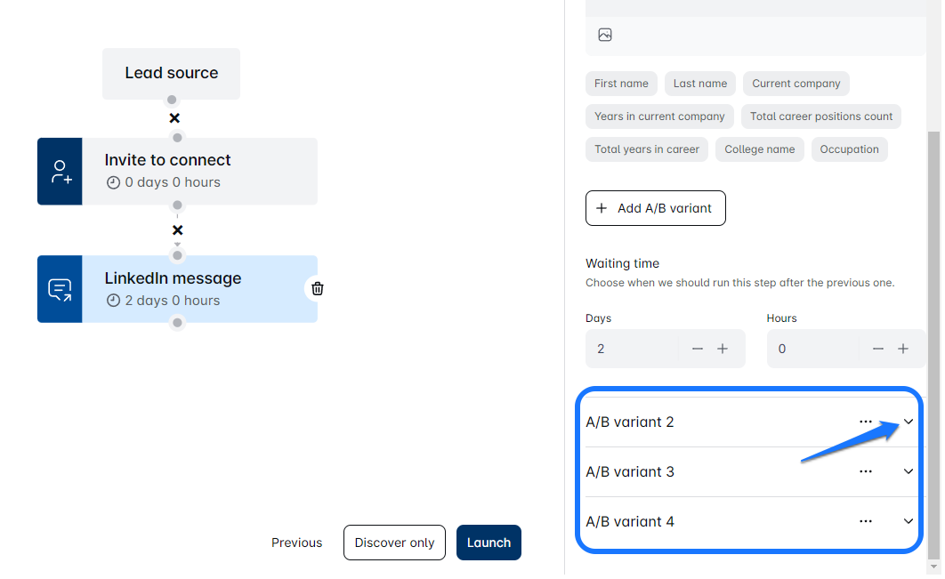 - In MOO Marketing, you can test different parts of your message copy, such as LinkedIn messages, Emails, InMails, Invites to Connect, or even the timing between the steps during the campaign sequence creation process. You can create up to 5 different test variants!