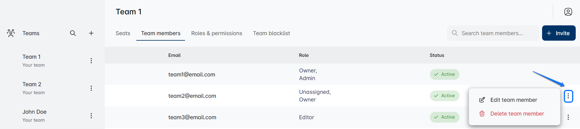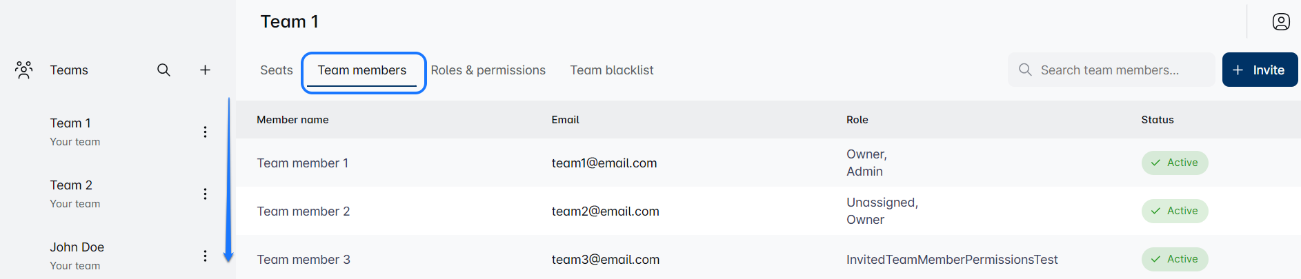 Click on 'Team members' tab for an overview of your team’s current lineup where you can see everyone’s roles, invite new members, and more.