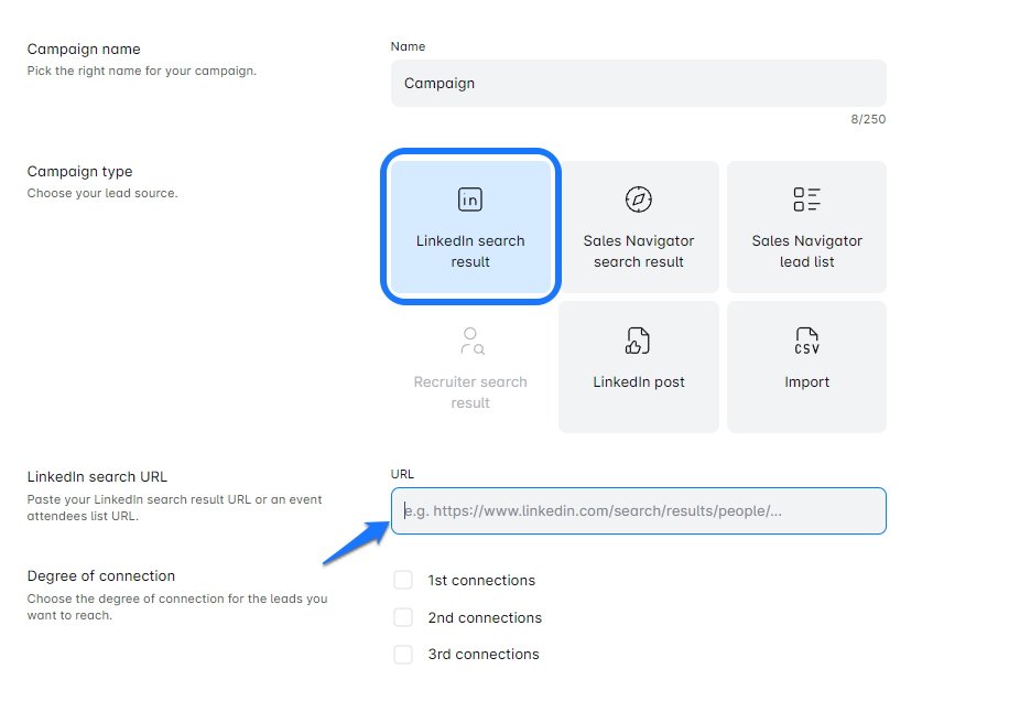 In MOO Marketing, paste your LinkedIn search URL into the designated area. Give your campaign a name that resonates with your goals.