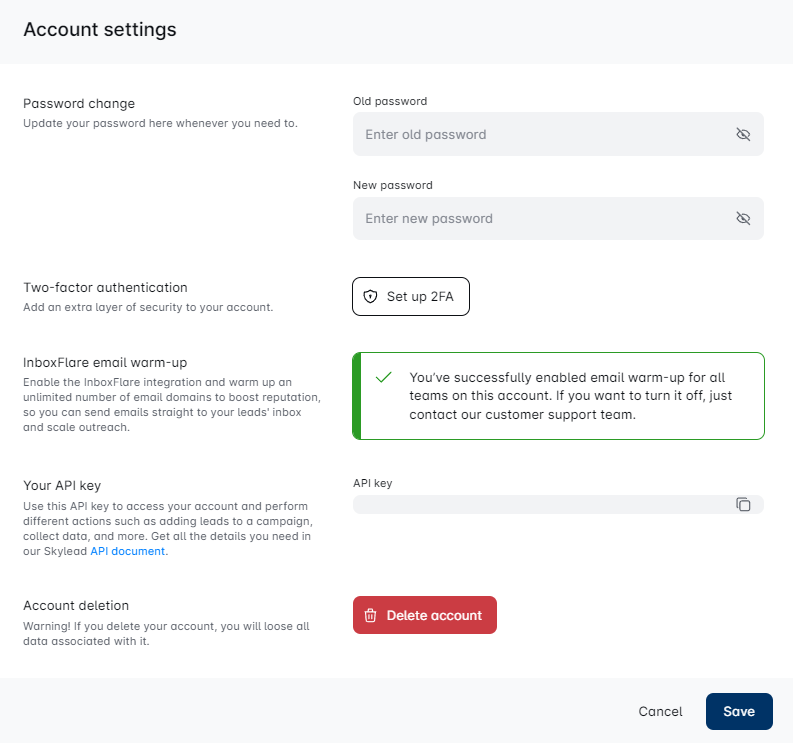 To get started, head over to your team dashboard. Click on your account icon and then navigate to Account Settings to find the InboxFlare email warm-up option. You'll be able to activate email warm-up only if you're a team owner of this specific team.